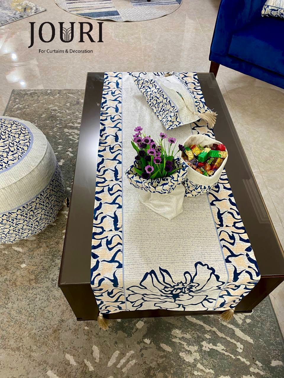 عزِّز ديكور منزلك بطقم كامل من الستائر، الكوشن، ومفرش السفرة، المصنوع من أجود أنواع القطيفة التركية ذات التصميم الراقي. الطقم يتميز بتصميم متناغم يضفي على المكان طابع أنيقاً وراحة بصرية ممتعة.