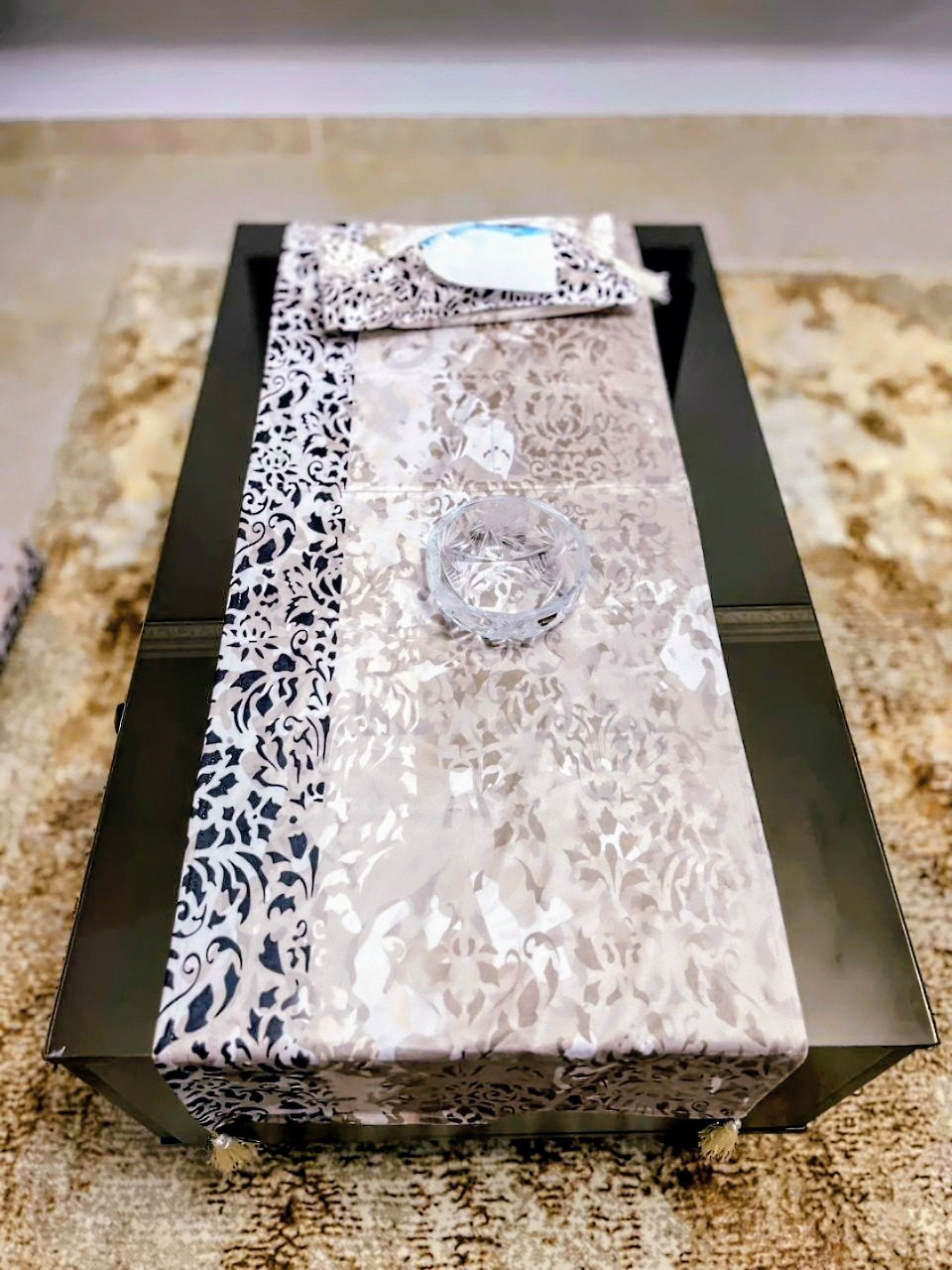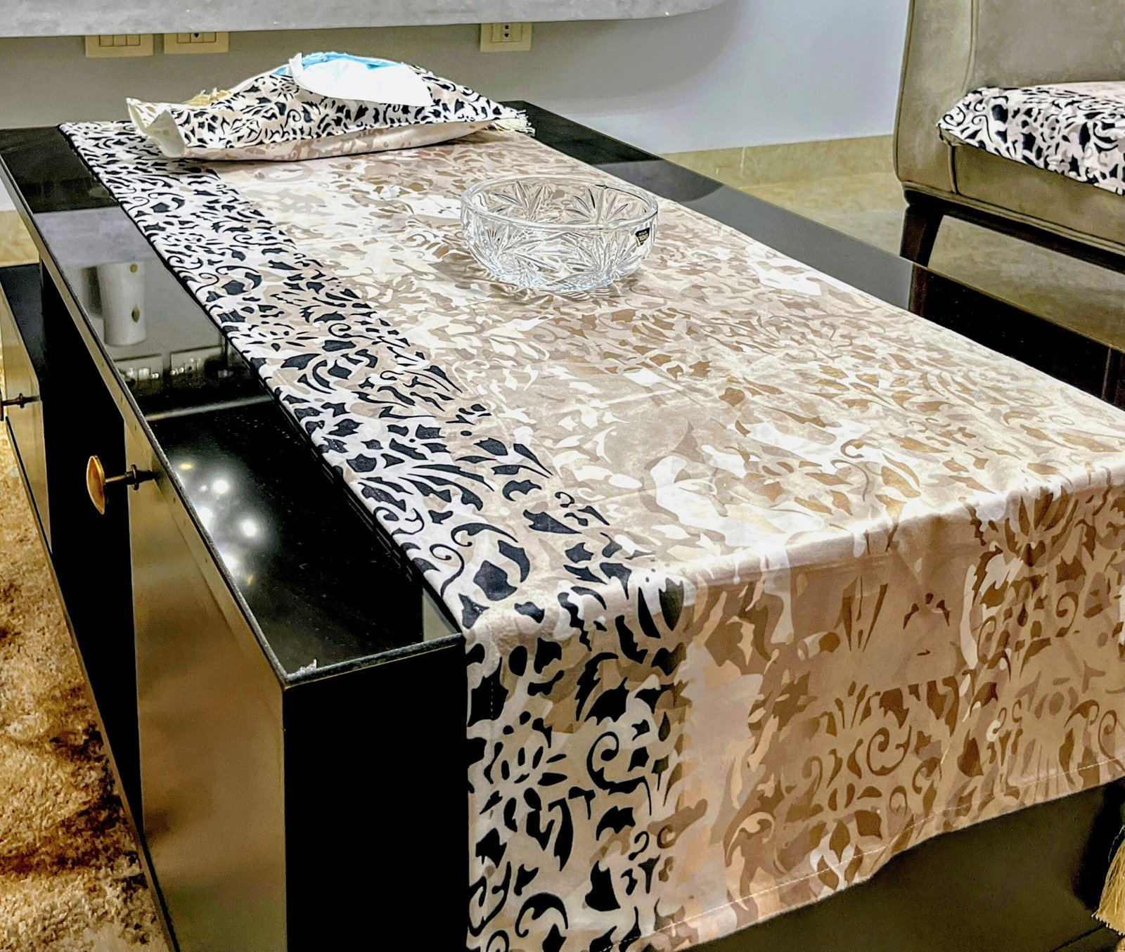 عزِّز ديكور منزلك بطقم كامل من الستائر، الكوشن، ومفرش السفرة، المصنوع من أجود أنواع القطيفة التركية ذات التصميم الراقي. الطقم يتميز بتصميم متناغم يضفي على المكان طابع أنيقاً وراحة بصرية ممتعة.