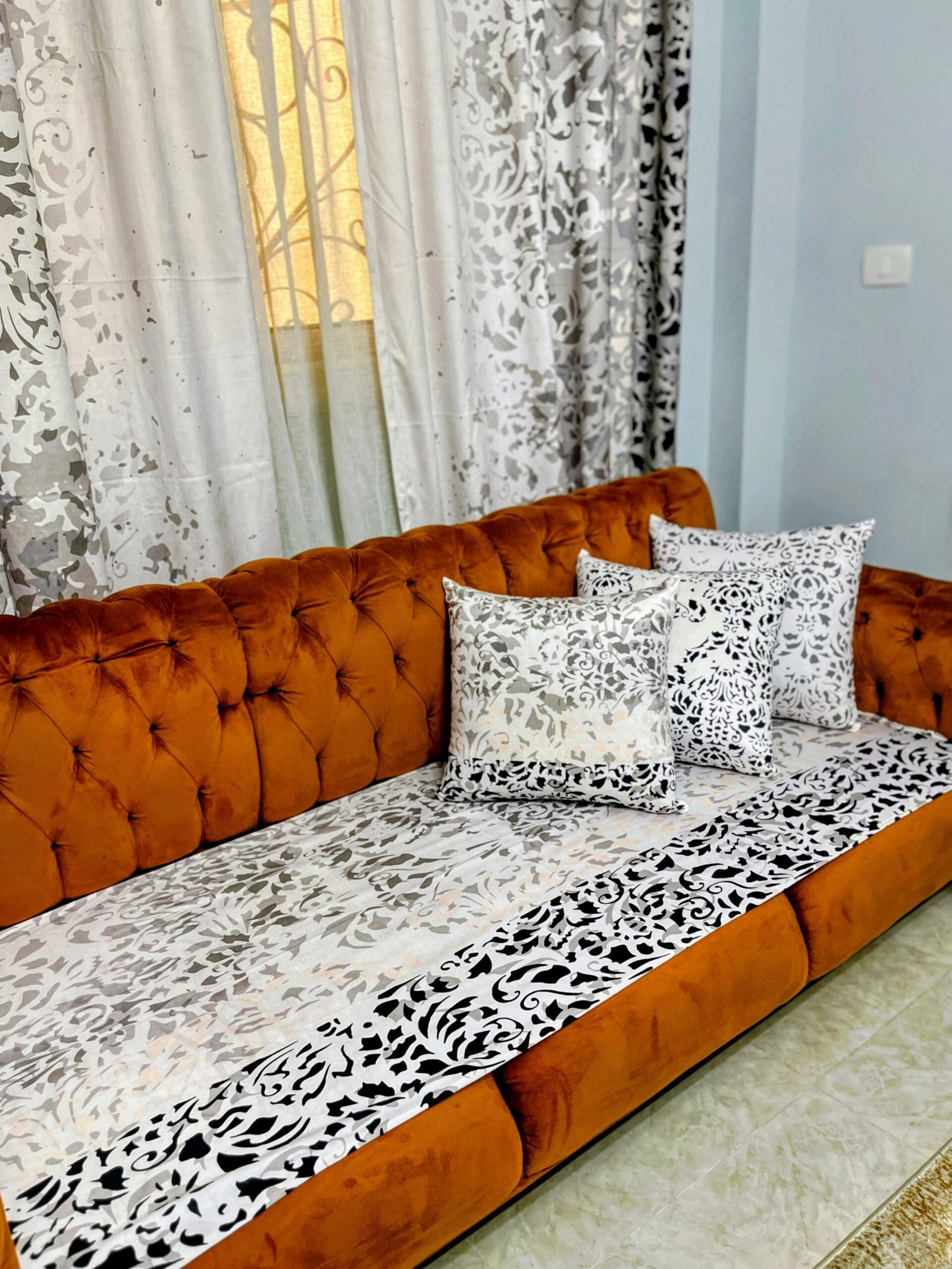 استمتع بلمسة من الفخامة التركية في منزلك مع استخدام هذا الطقم المصمم بعناية. الأقمشة القطيفة تقدم لمسة ناعمة وسحرية بالإضافة إلى تصميم عصري ينسجم مع مختلف أنماط الديكور. هذه المجموعة ستساعدك في تحويل مظهر منزلك لتعبّر عن شخصيتك وأسلوبك الفريد.